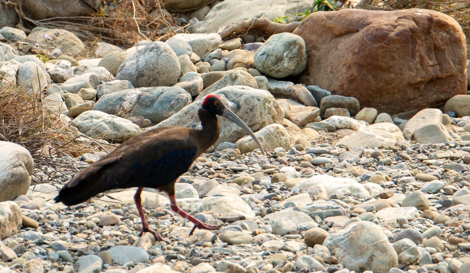 The red-naped ibis is a distinctive wading bird in and around Jim Corbett National Park, recognized by its dark plumage, curved bill, and red patch on the nape. Often seen near wetlands and open fields, it feeds on insects, frogs, and small aquatic life.
