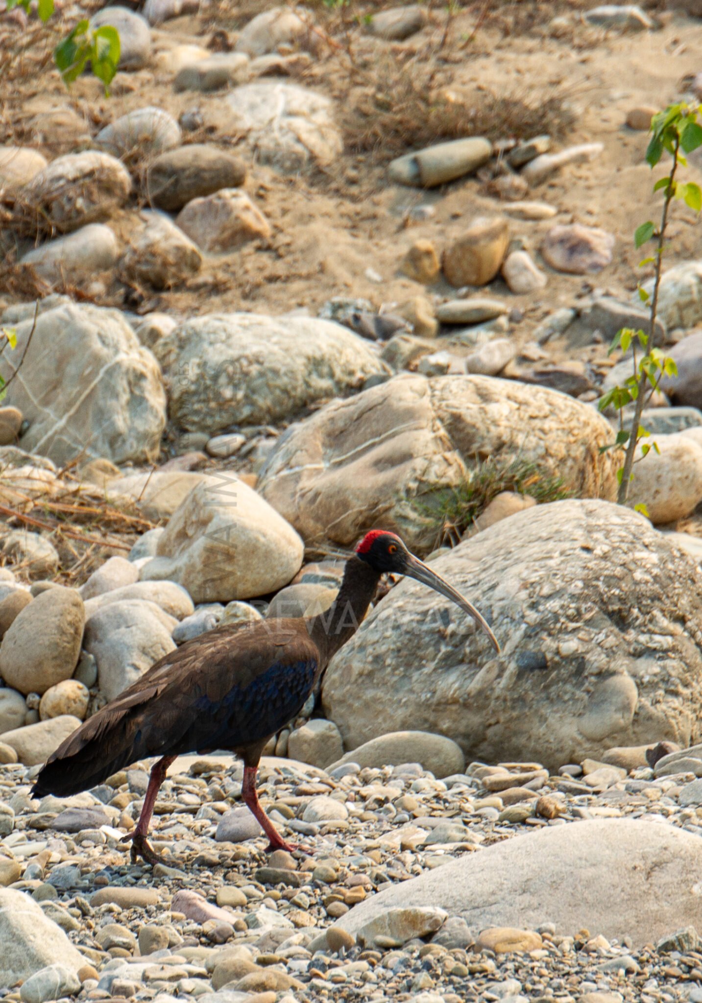 The red-naped ibis is a distinctive wading bird in and around Jim Corbett National Park, recognized by its dark plumage, curved bill, and red patch on the nape. Often seen near wetlands and open fields, it feeds on insects, frogs, and small aquatic life.
