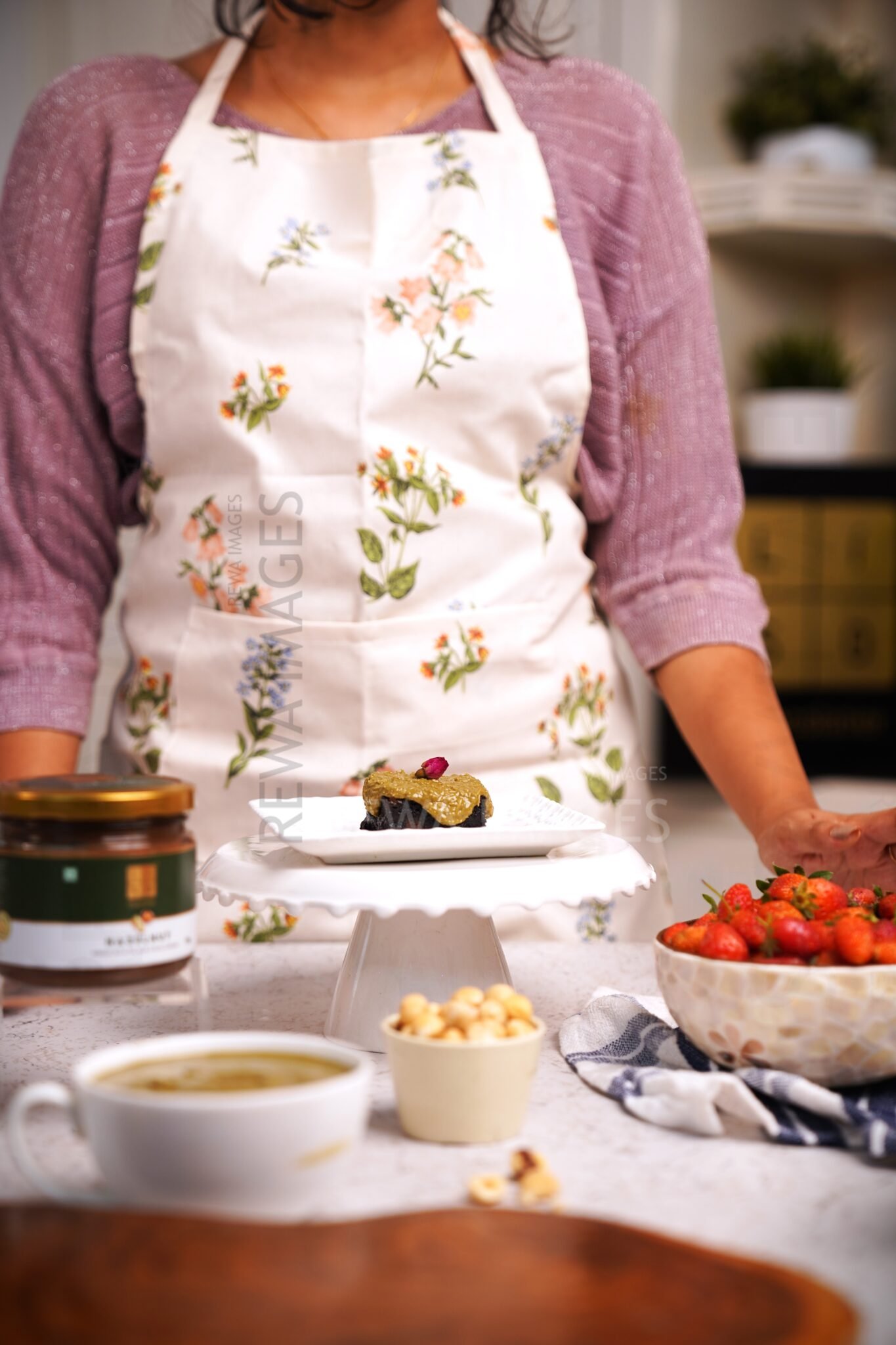 Home baker made chocolate brownie cake with pistachio, set in a nice kitchen table with a young genz woman in apron preparing the sweet and delicious dessert.