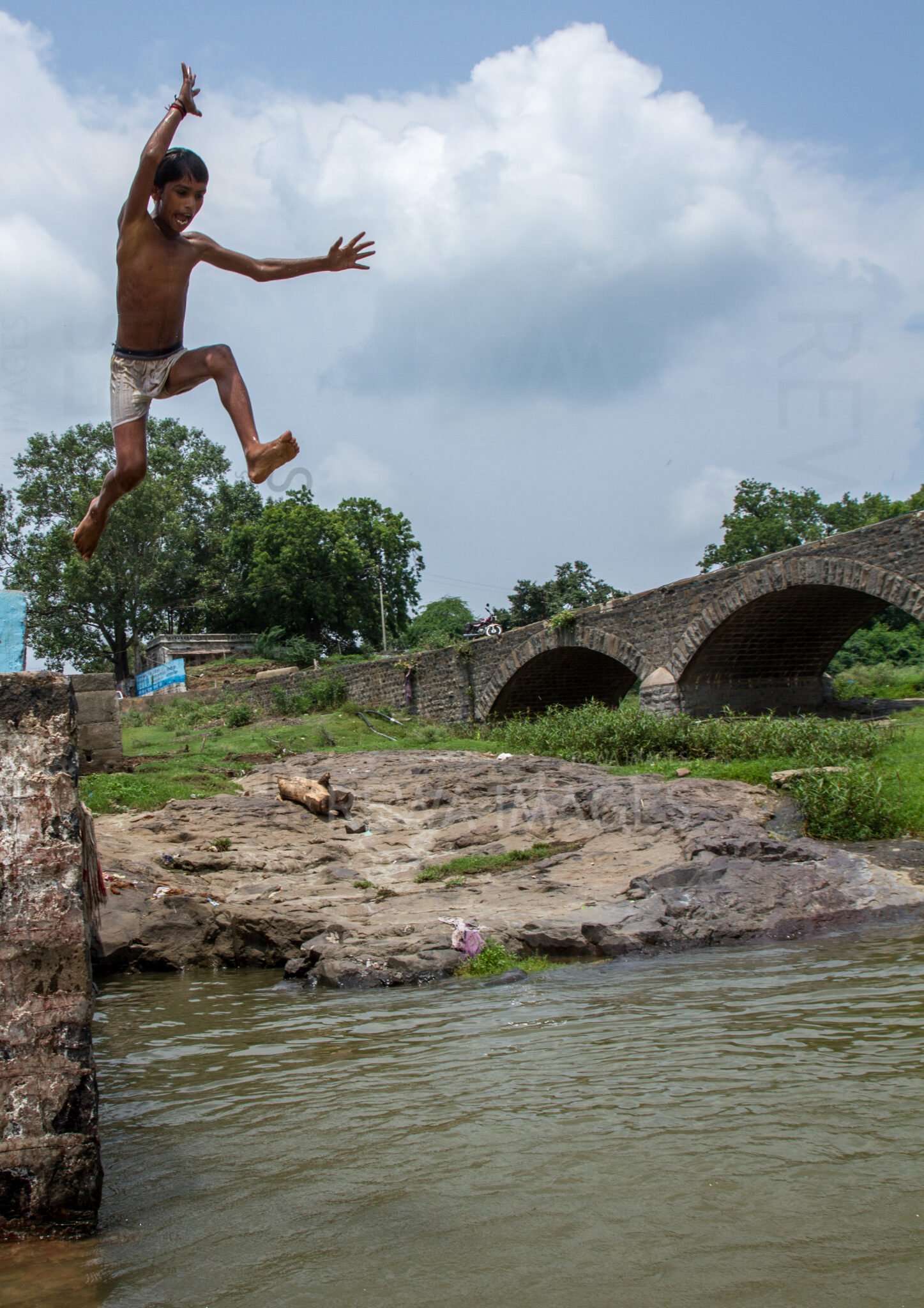 Kids leaping into the river