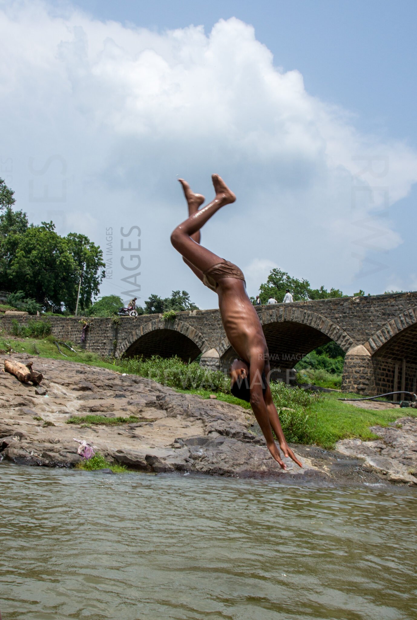 Kids leaping into the river