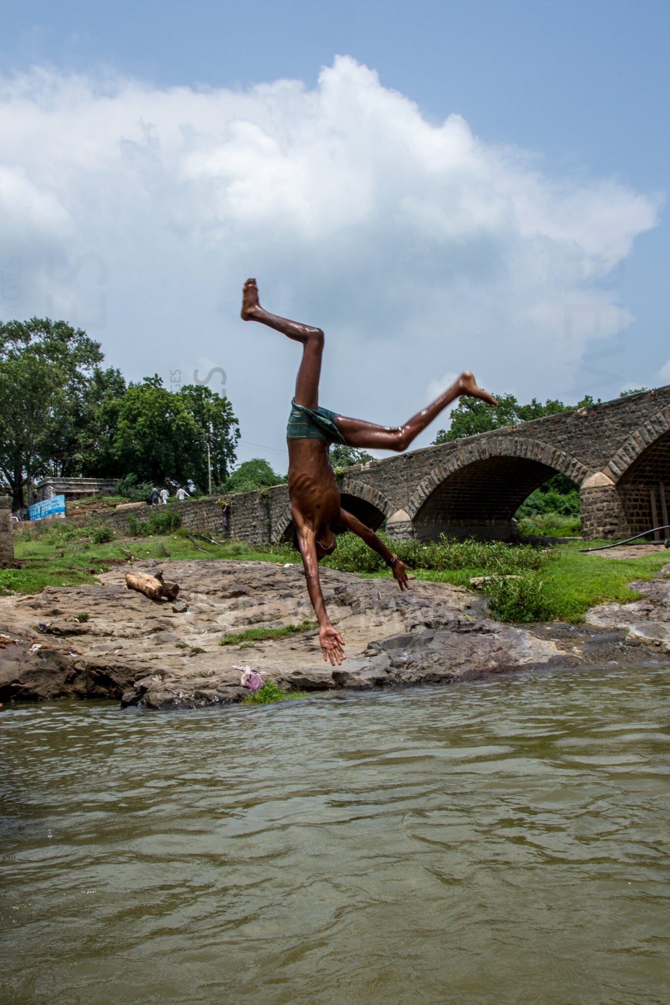 Kids leaping into the river